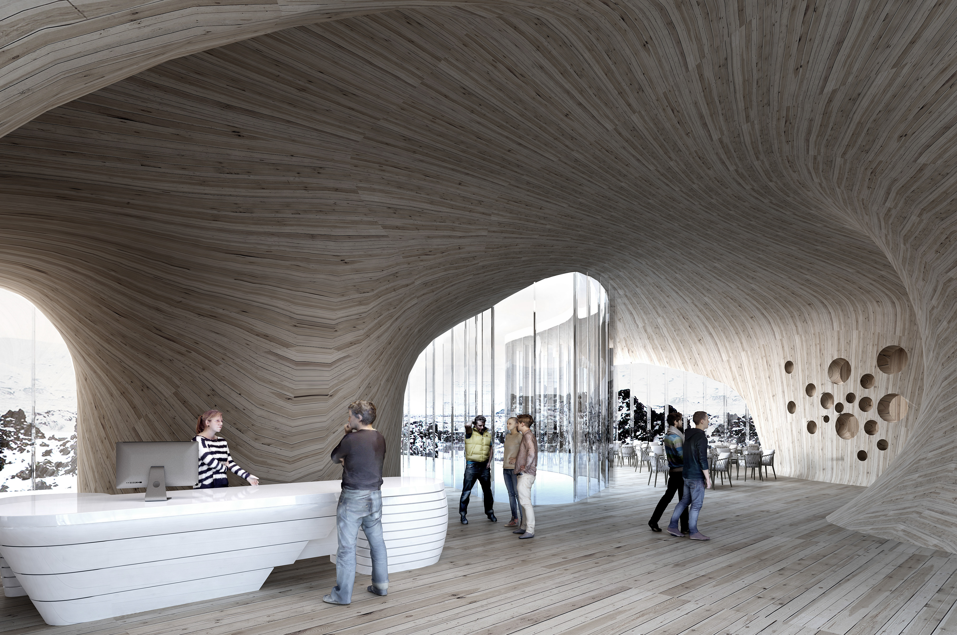 Texture Scaled pumice texture and rock foam-like structures have their abstract imprint in spatial distribution, function relationships, elevation textures and building structure itself. Materials chosen are concrete, metal, timber and glass, to match roughness and simplicity of Icelandic landscape