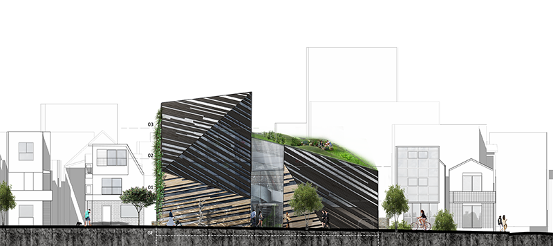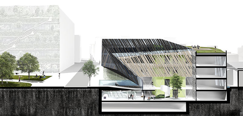 Geological Elevation. The building rises from the water with an elevation designed as an interpretation of geological layers, The stripes of black stone and glass are constructing the double skin elevation of the front of the building.
